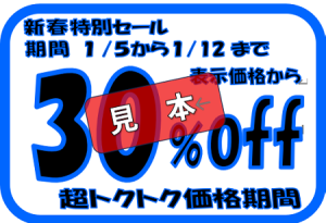 - ★内容:店内のおススメ商品に30%~10%OFF の『新春特別セール』ラベルが貼られております。そのラベルを宝探しの様に見付けてくださいね( *´艸`)ラッキ~♪